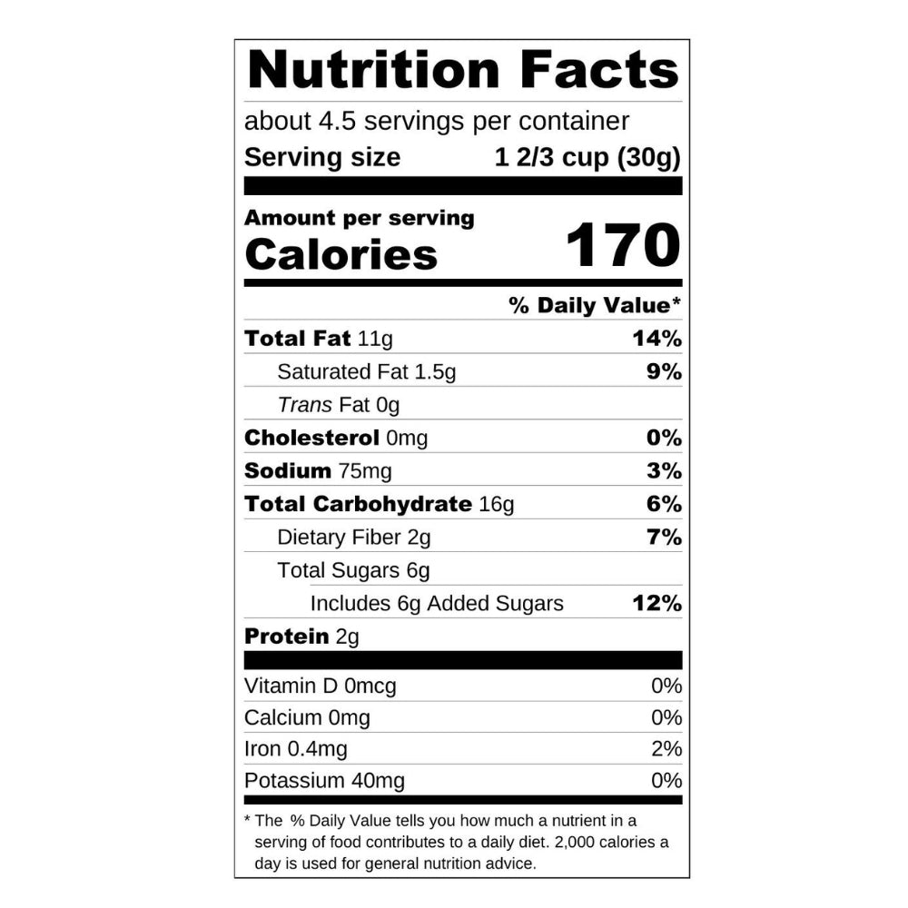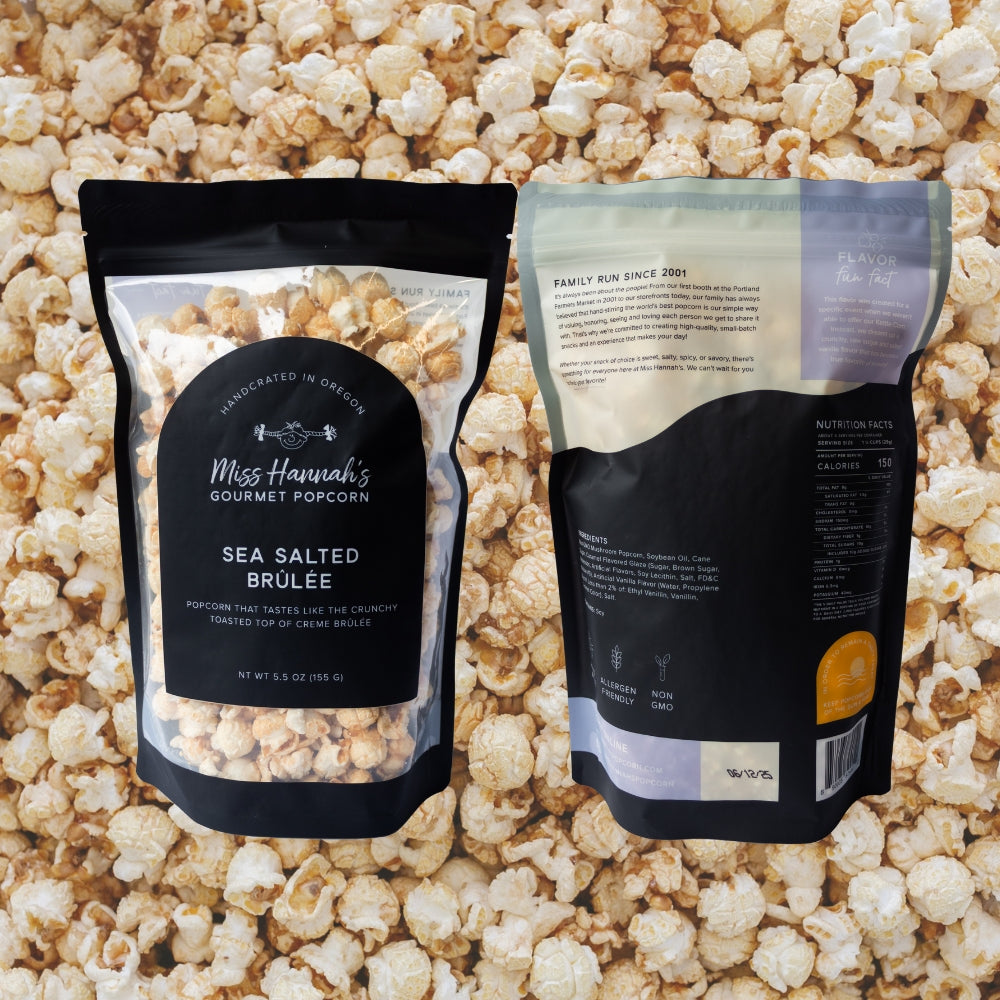 - Sea Salted Brûlée: A unique spin on sweet and salty, with caramelized sugars for a crunchy coating like the top of a crème brûleé paired perfectly with sea salt. (12x8x4 in bag, 5.5 oz)