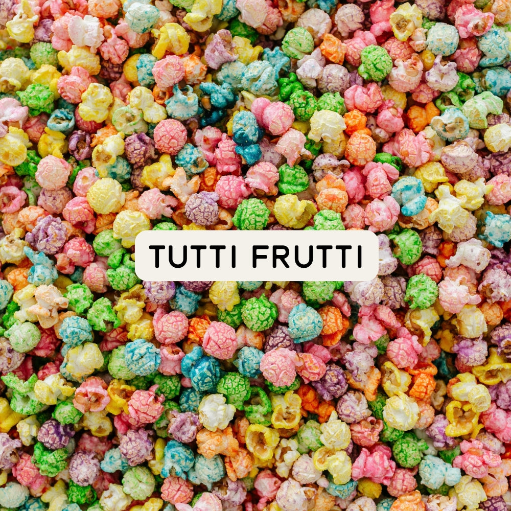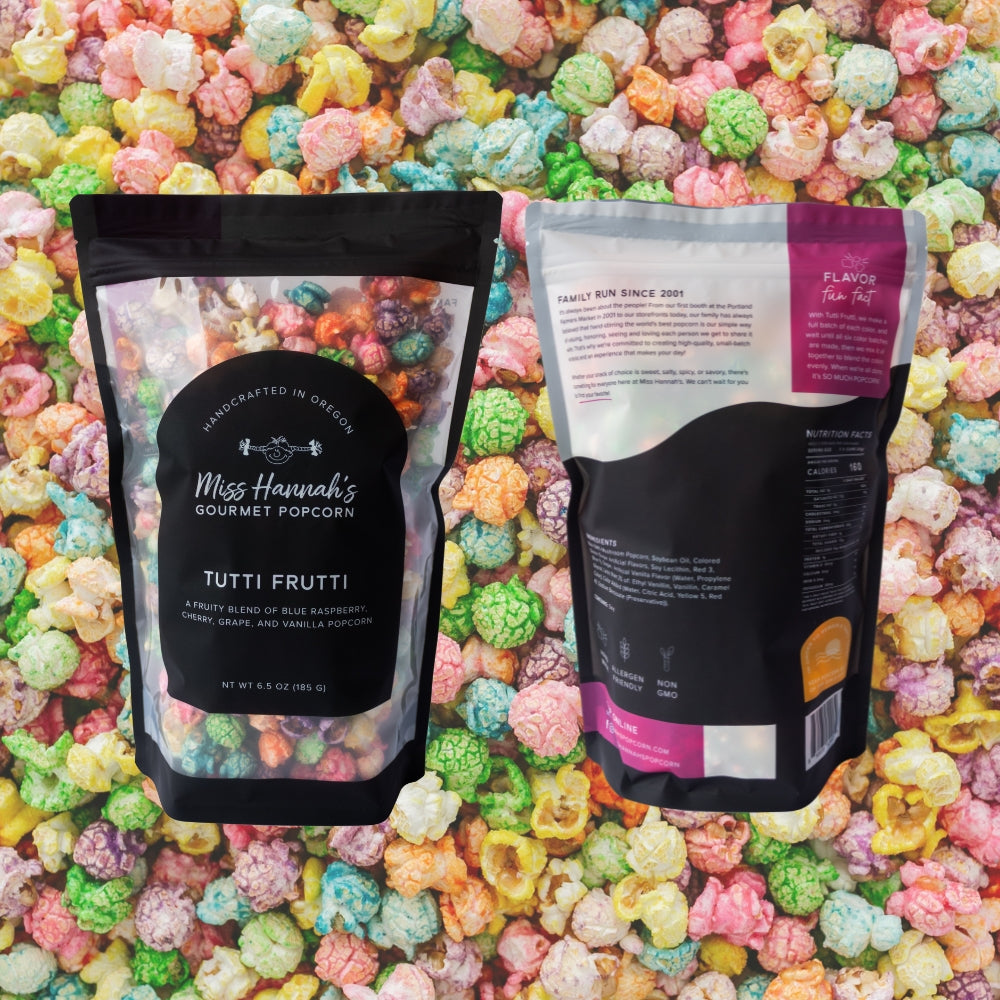 - Tutti Frutti: A colorful blend of blue raspberry, cherry, grape, and vanilla flavors. (12x8x4 in bag, 6.5 oz)